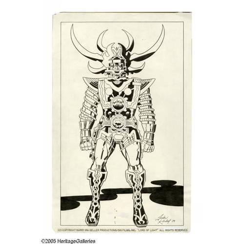 <B>Jack Kirby and Mike Royer - "Lord of Light" Presentation Piece Original Art (1978).</B></I> When it came to creating fantastic costumes for God-like characters, alien races, or science fiction heroes, Jack Kirby simply had no peers. In the late seventies, Kirby was commissioned to design the visuals for a film based on Roger Zelazny's novel, <B>Lord of Light</B></I>. A theme park also using Kirby concepts was planned, but the project was never realized. A key concept from the novel was the blending of Hindu mysticism from Ancient India with a modern technological society. As a result, this character sports the most ornate cosmic costume this side of Galactus! The splash page has an image area of 10.5" x 17.5", and the art is in Excellent condition.