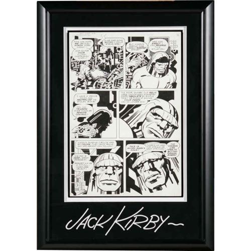 <B>Jack Kirby and Mike Royer - Unpublished "Hunger Dogs" Page 17 Original Art (DC, 1985).</B></I> Darkseid appears in every panel of this drama-drenched scene, which was slated for the "Hunger Dogs" graphic novel that concluded Jack Kirby's "New Gods" saga. However, the art was not published as inked by Mike Royer. He revealed why in the pages of the <B>Jack Kirby Collector</B></I>: "There are pages I inked in the Graphic Novel, but they're not the pages I inked. They're the pages that Greg Theakston re-inked because, as he said, in adapting the smaller formatted page to the larger Graphic Novel page, for some reason they weren't able to stat them so they'd work." Here is a chance to acquire the original Royer-inked version. Among the Kirby cognoscenti, Royer is regarded as perhaps "the King's" most faithful inker. Royer recalled in a <B>Jack Kirby Collector</B></I> interview, "I did what Jack wanted me to. Ninety percent of the time I completely submerged my personality and any desires to embellish. If you were to ask Jack privately, he'd say I was the truest inker to his pencils. When he finally retired from comics, he said that I was his favorite inker." The image area of this piece measures 10" x 15", and the art is in Excellent condition. The page was professionally framed, and the black overmat features an enlarged facsimile of Jack Kirby's famous signature.