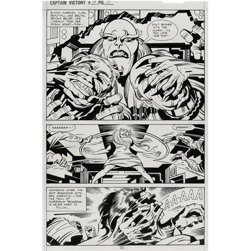 <B>Jack Kirby and Mike Thibodeaux - Captain Victory and the Galactic Rangers #10, page 11 Original Art (Marvel, 1983).</B></I> When a comic book story calls for savage, explosive action -- there's no doubt, Jack Kirby is the artist of choice. Bloody Marrien stars in this chilling battle scene from "The Voice." The image area of this hard-hitting page measures 10" x 15", and the art is in Excellent condition.