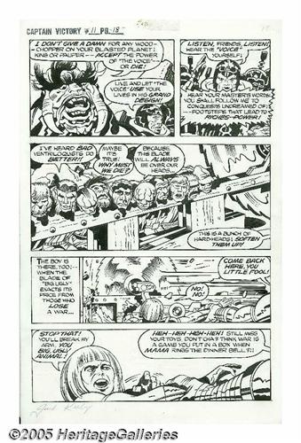 <B>Jack Kirby and Mike Thibodeaux - Captain Victory and the Galactic Rangers #11, page 18 Original Art (Pacific, 1983).</B></I> Jack Kirby was at the forefront of the creator-owned movement in 1981-83 with his <B>Captain Victory and the Galactic Rangers</B></I>, published by Pacific Comics. Big Ugly exacts his price from his war prisoners, while a young Captain Victory is forced to watch, in this page from "Meet Big Ugly," written and penciled by Kirby, with inks by Mike Thibodeaux. The image area measures 10" x 15" and the art is in Excellent condition. Signed by Jack Kirby in pencil at the lower left.
