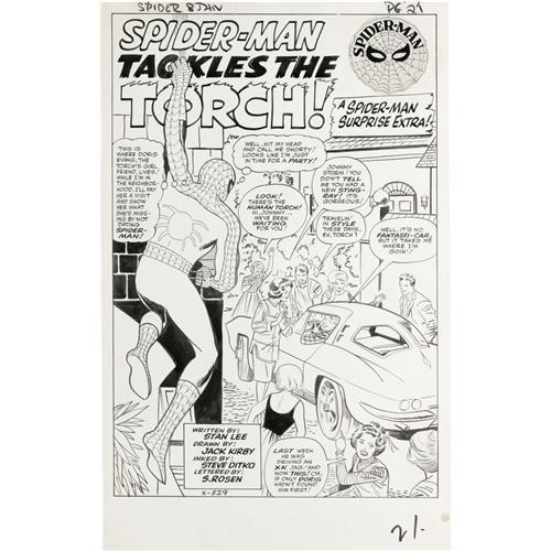 <B>Jack Kirby and Steve Ditko - Amazing Spider-Man #8, Splash Page 1 Original Art (Marvel, 1964).</B></I> Here's a sparkling gem from the heart of the mighty Marvel Age of comics - it's the scintillating splash from "Spider-Man Tackles the Torch." This captivating cross-over spotlighted a superstar team-up -- not just that of webhead and hothead, but also that of Marvel's two top-line talents, Jack "King" Kirby and "Sturdy" Steve Ditko. With scripting by Stan "the Man" Lee, this splash completes the compound of comic book creativity that skyrocketed Marvel to the top of the industry. The image area of the art measures approximately 12.5" x 18.5", and the page is in Excellent condition.<BR><BR><b>Shipping:</b> Large Flat (<a target="_blank" href="http://www.heritageauctions.com/common/shipping.php">view shipping information</a>)