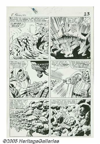 <B>Jack Kirby and Vince Colletta - Fantastic Four #40, page 17 Original Art (Marvel, 1965).</B></I> <I>It's Clobberin' Time!</B></I> Dr. Doom pushed the Thing into a blood rage in this slam-bang scene from "Battle of the Baxter Building," and nothing, but <I>nothing</B></I>, would stop the Thing from getting his mitts on Dr. Doom. The page hails from one of the greatest battle scenes in all Marvel lore! Jack Kirby's dynamic art was ideally showcased in the "twice-up" format of the early Marvel art. Three superb portraits of Dr. Doom doing his worst are a highlight of this page. The art measures 12.5" x 18.75" and is in Excellent condition. This block-bustin' page showcased the brand of thrilling "King" Kirby action that made the <B>Fantastic Four</B></I> "the World's Greatest Comic Magazine!"