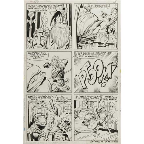 <B>Jack Kirby and Vince Colletta - Thor #176, page 3 Original Art (Marvel, 1970).</B></I> "What flea doth presume to goad the lion?" The voluminous and valiant Volstagg takes center stage in this rowdy romp. This page has an image area of 10" x 15", and its condition is Excellent. <BR><BR><b>Shipping:</b> Flat Material, Small (<a target="_blank" href="http://www.heritageauctions.com/common/shipping.php">view shipping information</a>)