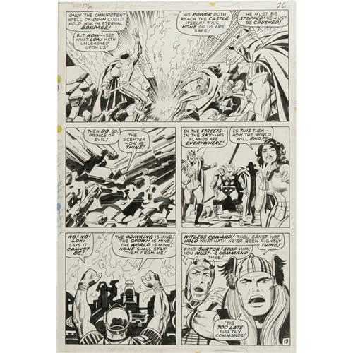 <B>Jack Kirby and Vince Colletta - Thor #176, page 19 Original Art (Marvel, 1970).</B></I> The power and the drama that only the "King," Jack Kirby, could have unleashed are showcased in this spectacular page. Loki, Thor, Balder, and Sif -- the legendary gods of Asgard are here! This page has an image area of 10" x 15", and its condition is Excellent.<BR><BR><b>Shipping:</b> Flat Material, Small (<a target="_blank" href="http://www.heritageauctions.com/common/shipping.php">view shipping information</a>)