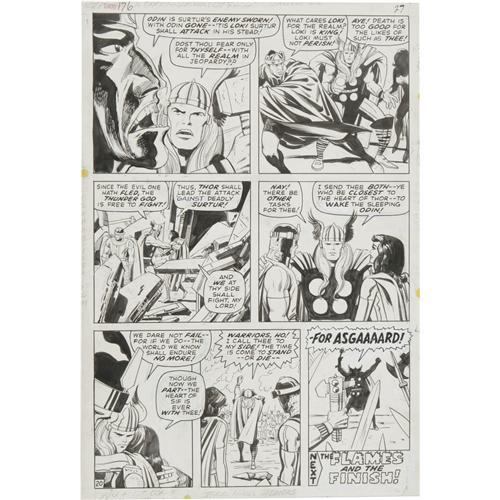 <B>Jack Kirby and Vince Colletta - Thor #176, page 20 Original Art (Marvel, 1970).</B></I> While Loki flees the scene, Thor rallies the troops in the closing scene, which also announces the conclusion to this cliffhanger, "The Flames and the Finish." This page has an image area of 10" x 15", and its condition is Excellent.<BR><BR><b>Shipping:</b> Flat Material, Small (<a target="_blank" href="http://www.heritageauctions.com/common/shipping.php">view shipping information</a>)