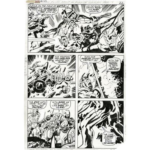 <B>Jack Kirby and Vince Colletta - Thor #177, page 17 Original Art (Marvel, 1970).</B></I> This scene from near the end of Jack Kirby's spectacular stint on <B>Thor</B></I> spotlights the apocalyptic struggle of the Gods of Asgard against Surtur, the fire demon, and ruler of Muspelheim. The rise of a new breed of heroes from the fallen Gods of old was a theme Kirby soon explored over at DC comics, with his legendary "Fourth World" saga. As a result, this dynamic page foreshadows a turning point in Kirby's career. The image area of the page measures 10" x 15". The lower right corner of the page has been torn off; otherwise, the art is in Very Good condition.