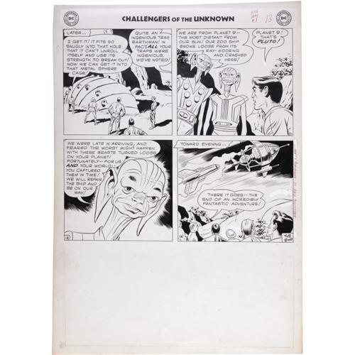 <B>Jack Kirby and Wally Wood - Challengers of the Unknown #7, page 13 Original Art (DC, 1959).</B></I> The sensational combination of two comic book hall-of-famers, Jack Kirby and Wally Wood, proved perfect for bringing the tried-and-true space opera hallmarks to life in the fifties -- namely, weird alien creatures and state-of-the-art spaceships. The result is this stunning closing page from the Challengers of the Unknown thriller "The Beast From Planet Nine." The image area of this "two-thirds" page measures 13" x 12" and the art is in Excellent condition. <BR><BR><b>Shipping:</b> Flat Material, Large (<a target="_blank" href="http://www.heritageauctions.com/common/shipping.php">view shipping information</a>)