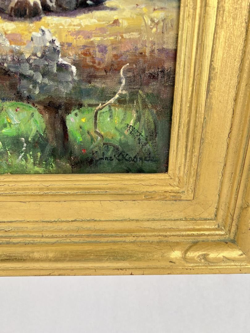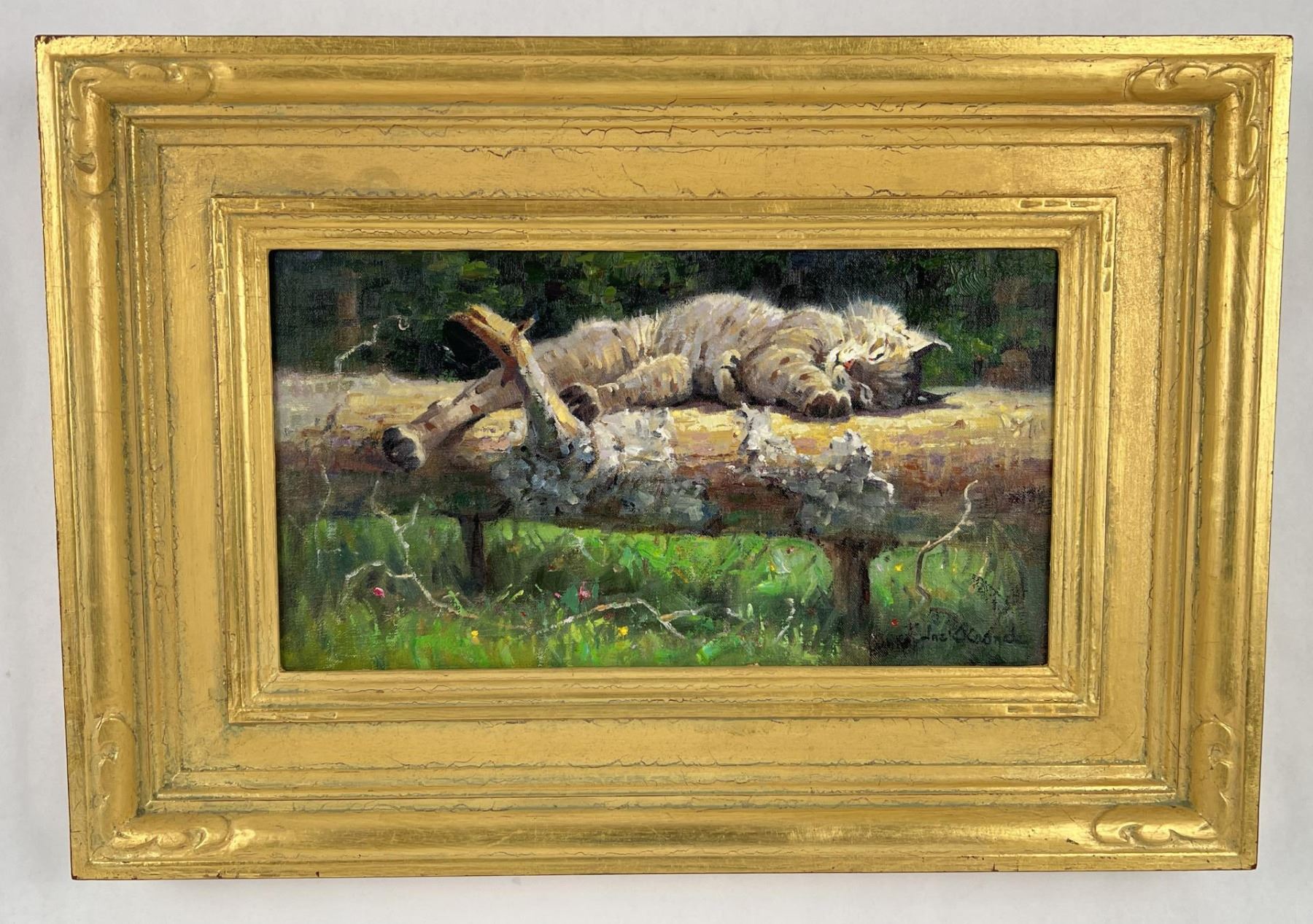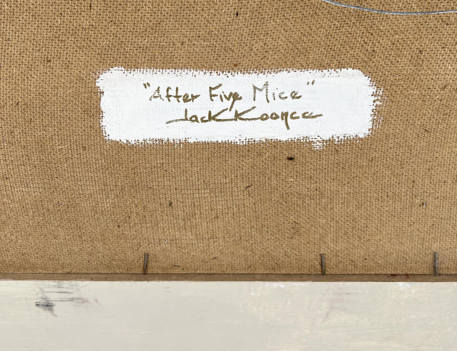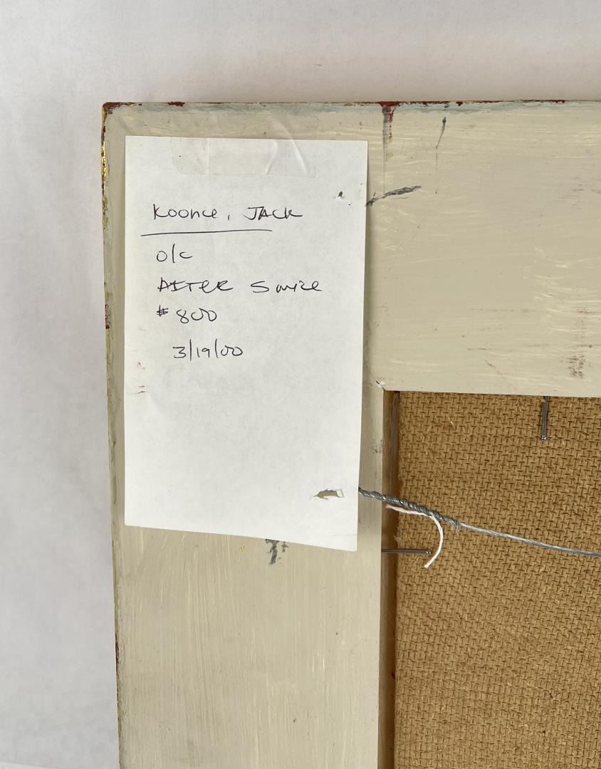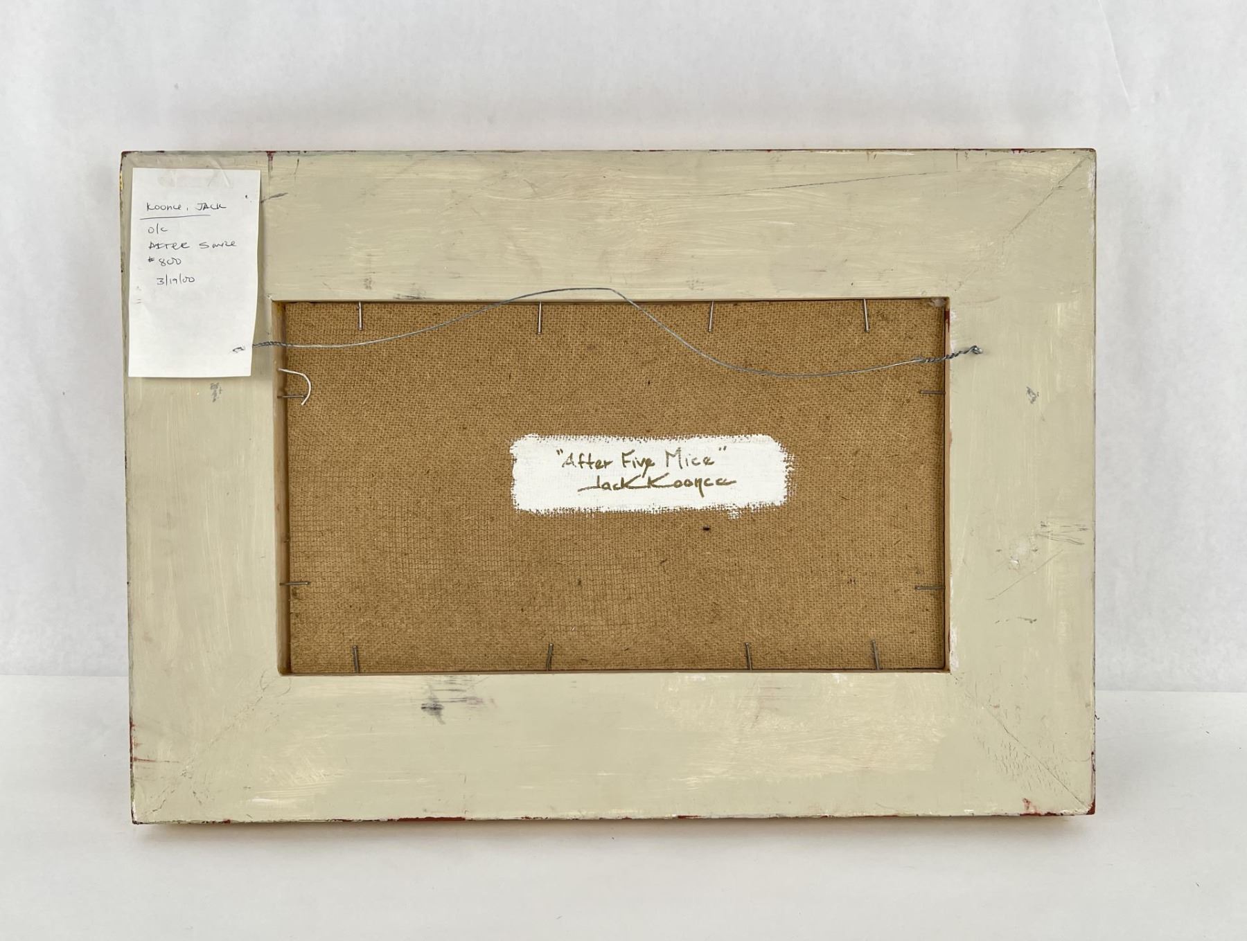 Title is After 5 Mice. 9" by 16" unframed. 16 1/4" by 23 1/2" framed. Jack Koonce (20th century) was active/lived in Idaho. Jack Koonce is known for Wildlife in landscape painting. Jack Koonce was raised in the sagebrush hills and craggy mountain peaks of Central Idaho, where he spent a childhood rambling through the vast rugged wilderness that was his backyard. Fishing, hunting, hiking, backpacking, skiing and sketching all combined to forge a deep and elemental bond with nature, and his canvases are evidence of that profound connection. Koonce recalls of his initial trip to the high alpine backcountry: "The first time I made it to high altitude in summer,I was hooked. Stunted trees and deep, green, grass against snow-white granite. Flowers everywhere..It was a masterwork." Cold, snowy winters worked their magic too. For back in the day, when the snows fell, Idaho mountain kids took to the slopes and skied. Long winters spent in the practice of ski racing - a difficult and somewhat obscure discipline - did much to forge Koonce's character, and painting style. In his work, he clearly draws upon the fearlessness, self-reliance, perseverance and, maybe especially, sheer awe, which the mountains demand of those who travel there. They're excellent teachers. "Skiing is about the mastery of craft as a way to discover beauty… and avoid disaster. That same mastery is required to find truth in the expression of painting," says Koonce. A lifetime of exploring the natural world also taught him to trust his instincts, he says, giving him "the courage to launch myself in a direction with utter abandon. It is this confidence in the unknown that I find myself turning to, in my work, time and time again." Living today on the Eastern edge of Idaho's Smoky Mountains, Koonce still finds spiritual and artistic inspiration in his rugged backyard. "Sometimes now I see wildlife, and I'll paint them where and how they stand, but more appealing to my sensibilities is to compile, from years of observation, the scene, the gestures, the mood..bringing them together into an imaginative whole. This, I think, makes my approach different from many wildlife artists who use photographs in a more literal manner. My approach is conceptual in its construction." It's an approach to life, and now his life's work, that has left him regretless. "It offers the endless excitement of perpetual discovery." Jack Koonce studied and taught art and biology at the highschool and college level prior to embarking upon a fulltime career as an artist. He is currently a signature member of the "Society of Animal Artists", New York, the "Worlwide Nature Artists Group and the "Oil Painters of America", Chicago. He has received several awards and is currently on a national museum tour representing the Society of Animal Artists.