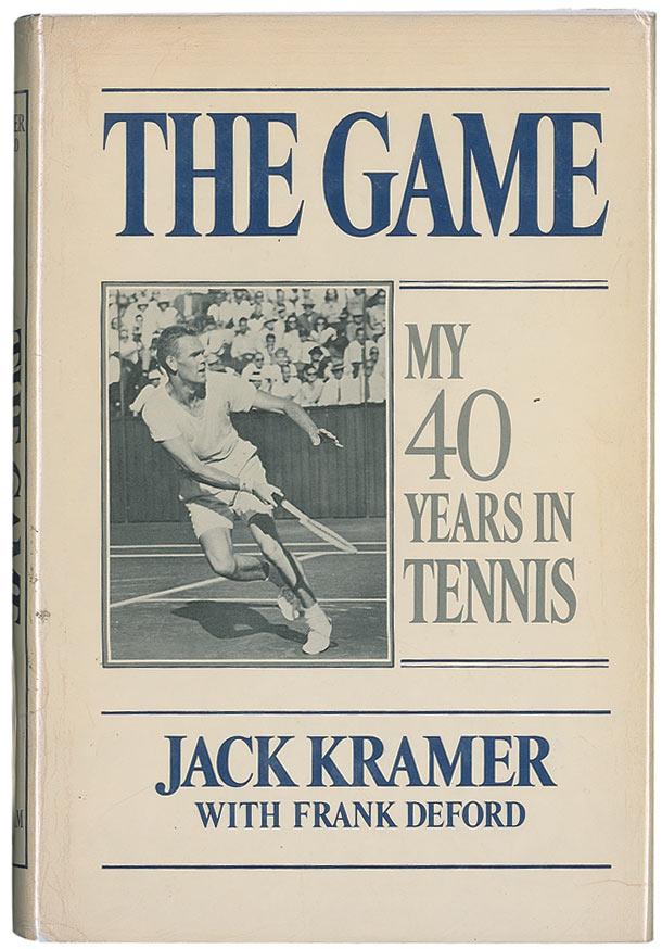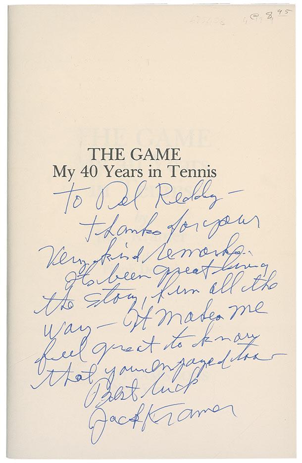 Signed book: The Game. First edition. NY: G.P. Putnam’s Sons, 1979. Hardcover with dustjacket, 6.25 x 9.25, 318 pages. Signed and inscribed on the half-title page, “To Del Reddy—Thanks for your very kind remarks. It’s been great living the story, fun all the way—It makes me feel great to know that you enjoyed too. Best luck, Jack Kramer.” In fine condition, with some light wear and toning to dustjacket.