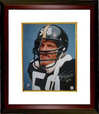 Jack Lambert was known for the hard hits he delivered to members of the opposing team. Lambert prided himself on his ability to hit hard and intimidate the opposition. He was a 9 Time Pro Bowl selection, 7 time First-team All-Pro selection, 4 time Super Bowl champion, voted to the NFL 75th Anniversary All-Time Team, voted to the NFL 1970's and 1980s All-Decade Team, 1974 NFL Defensive Rookie of the Year, 1976 NFL Defensive Player of the Year and Elected to the Pro Football Hall of Fame in 1990. Jack Lambert has hand autographed this Pittsburgh Steelers 16x20 Photo with HOF 90 inscription. Lambert Hologram and Certificate of Authenticity from Athlon Sports. Custom White Mat and Premium Mahogany Frame as shown.