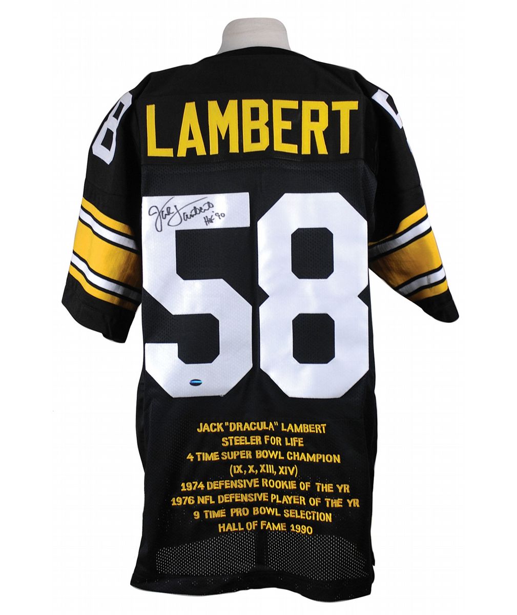 Replica Pittsburgh Steelers football jersey, with sewn on letters and numbers, as well as Lambert’s career statistics embroidered on the reverse, signed in black felt tip on the number on the back, “Jack Lambert, HOF ’90.” In fine condition.