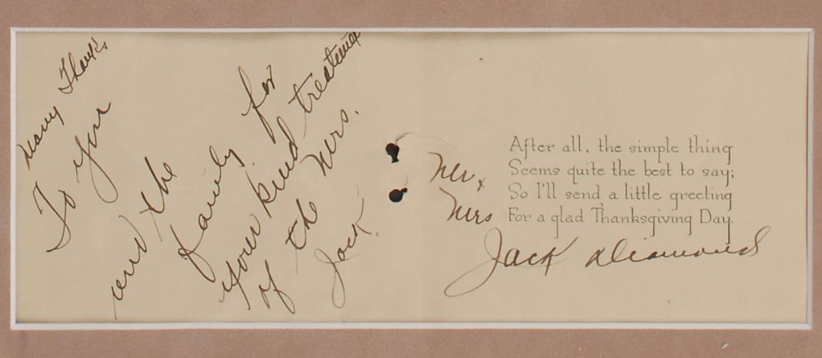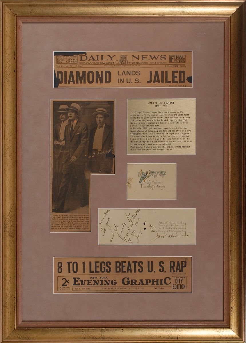 Prohibition–era bootlegging gangster (1897–1931) and close associate of gambler Arnold Rothstein who managed to survive several assassination attempts before being killed at age 34. Thanksgiving card featuring a printed poem, signed inside twice in fountain pen, “Many Thanks To You and the family for your kind treatment of the Mrs., Jack” and “Mr. & Mrs. Jack Diamond.” Matted and framed with newspaper clippings and a plaque to an overall size of 19 x 27. In fine condition, with two ribbon holes at center.