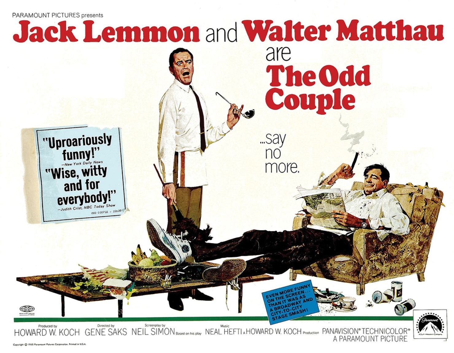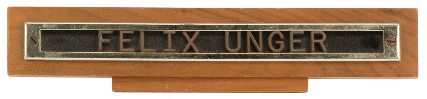 103. Jack Lemmon "Felix Unger" desk nameplate from The Odd Couple.(Paramount, 1968) Vintage original set piece from the movie adapted from the beloved Neil Simon stage comedy. Constructed of wooden panel on an incline wooden base with a slotted metal nameplate affixed with metal letters inset spelling out, "Felix Unger". The desk nameplate measures 12 x 2.5 x .05 in. Visible on Felix's (Jack Lemmon) desk in the film. Exhibiting age and minor production wear. In vintage very good to fine condition. Originally from the collection of Set Decorator Ray Moyer. $400 - $600