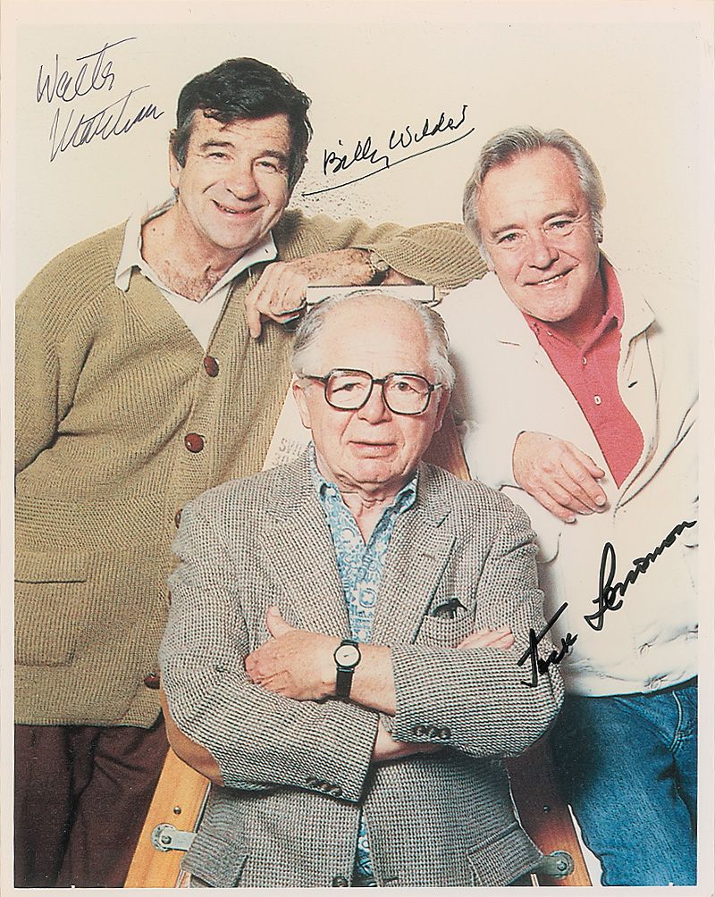 Color glossy 8 x 10 photo of the Buddy Buddy stars and director, signed in black felt tip by Jack Lemmon, Walter Matthau, and Billy Wilder. In fine condition.