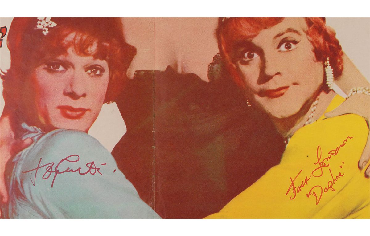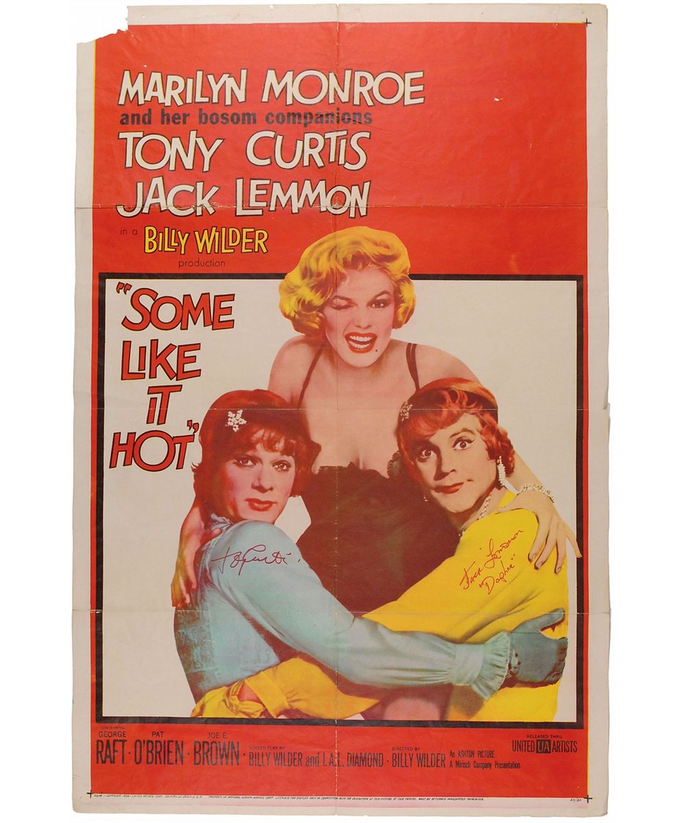 Original color 27 x 41 one-sheet movie poster for Some Like It Hot, signed in felt tip by Tony Curtis and Jack Lemmon, who adds his character name under his signature. A few small separations along expected storage folds, missing top left corner tip, tape repairs to reverse, some tack holes and small tears to top edge, a few creases, and some scattered light toning, otherwise very good condition. While signed photos from the film are frequently encountered, original posters from this comedy classic signed by the two stars are quite uncommon.