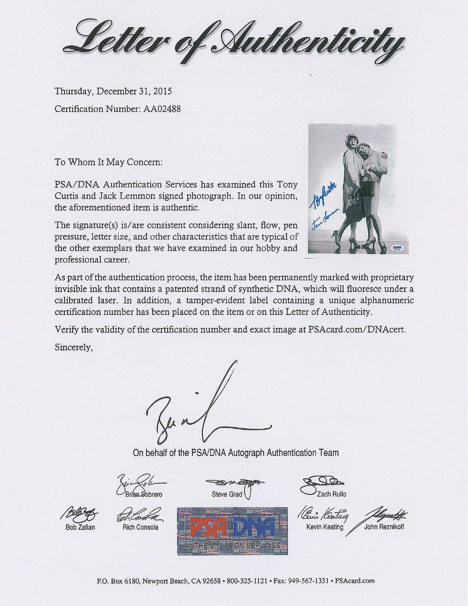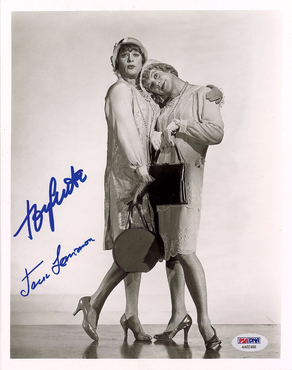 Glossy 8 x 10.25 photo of Jack Lemmon and Tony Curtis from the 1959 film Some Like It Hot, signed in blue felt tip by both. In fine condition. Accompanied by a full letter of authenticity from PSA/DNA.