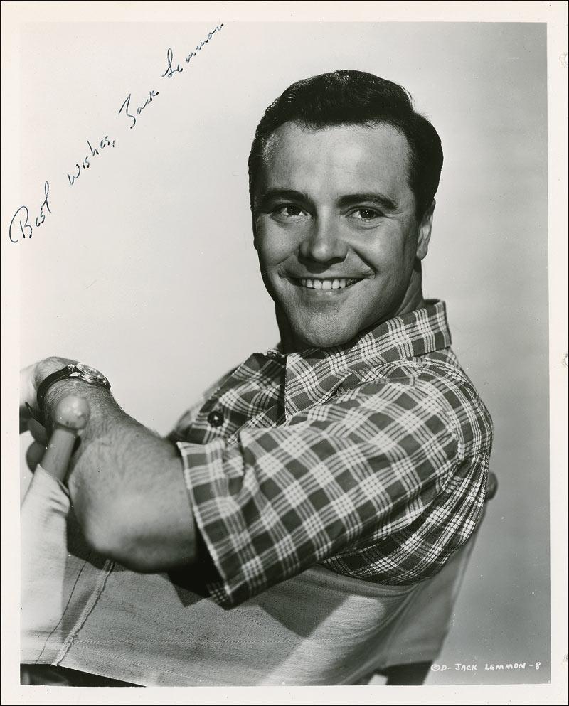 Vintage glossy 8 x 10 photo of Lemmon looking over his shoulder, signed in black ink, “Best wishes, Jack Lemmon.” Binder dings to right edge, a few scattered creases and surface marks, and light irregular adhesion to signature and sentiment, otherwise fine condition. Pre-certified PSA/DNA and RRAuction COA.