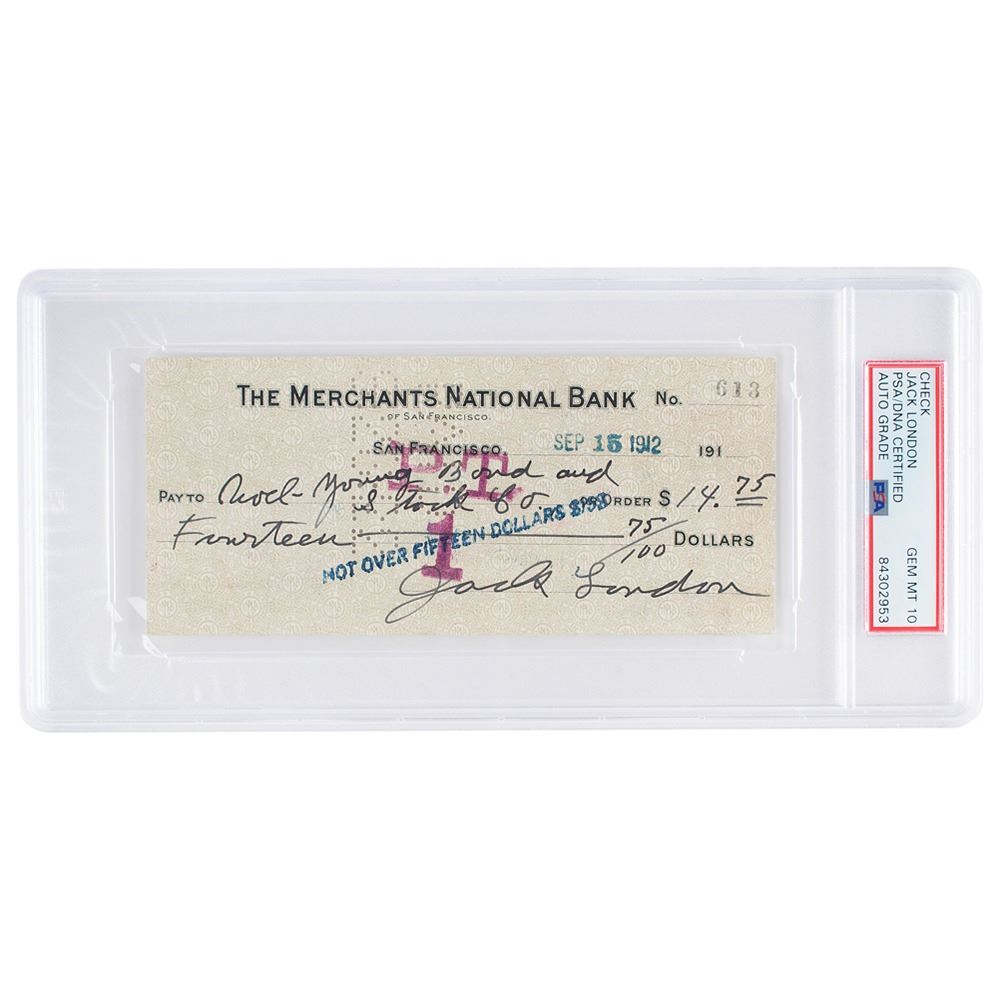 The Merchants National Bank check, 6.25 x 2.75, filled out and signed by London, "Jack London," payable to Noel-Young Bond and Stock Co. for $14.75, stamp-dated September 15, 1912. In fine condition. Encapsulated in a PSA/DNA authentication holder, grading the autograph as "GEM MINT 10."