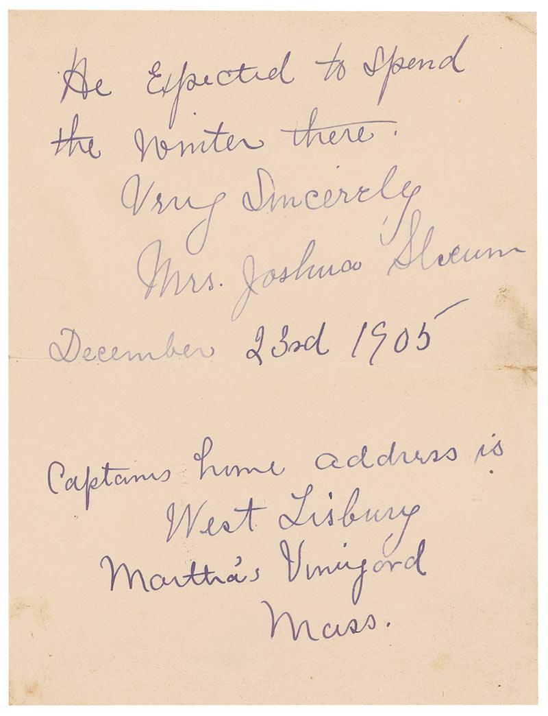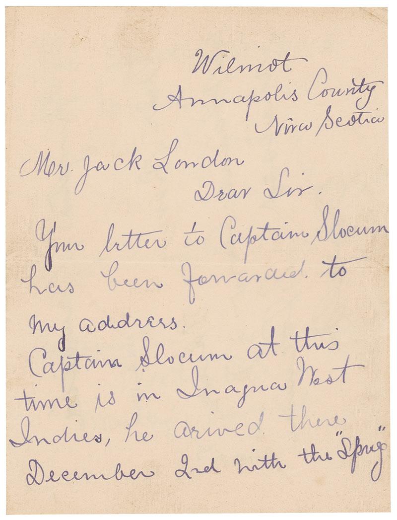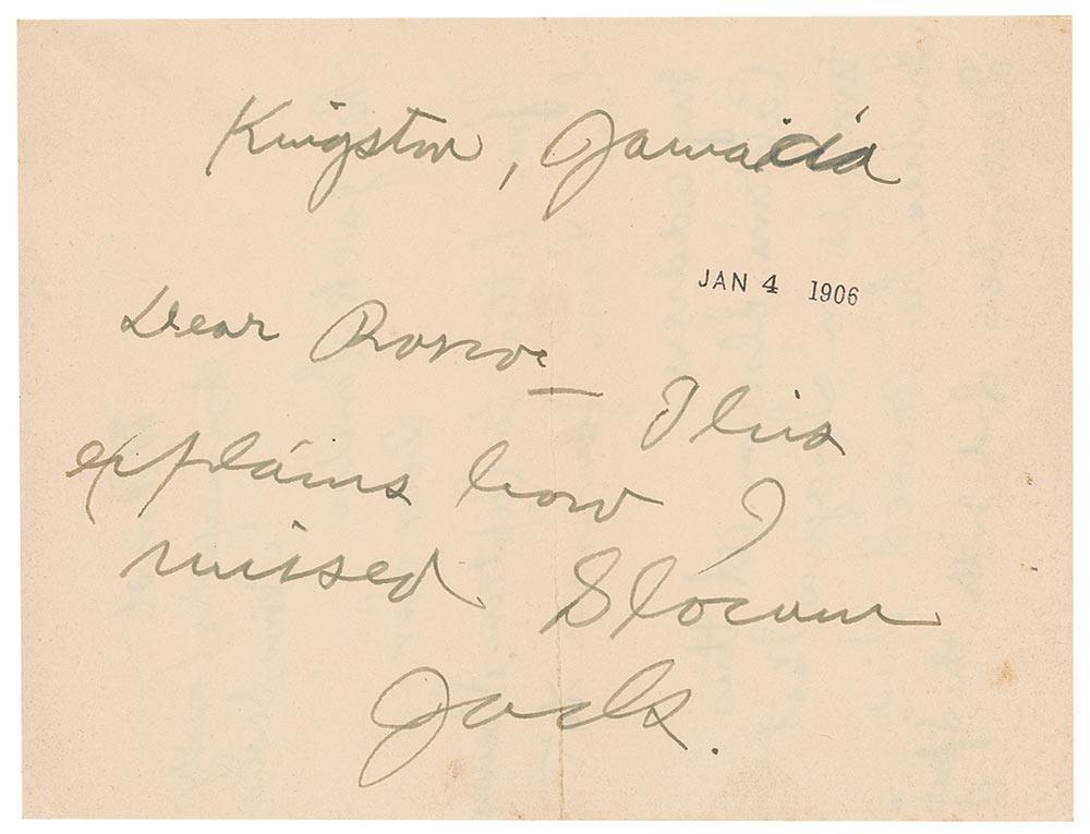 Brief ALS signed “Jack,” one page, 6.5 x 5, stamp-dated January 4, 1906. London’s letter is written on a blank sheet of a two-page letter to London from Mrs. Joshua Slocum, wife of Captain Joshua Slocum. Mrs. Slocum’s letter reads, in full. “Your letter to Captain Slocum has been forwarded to my address. Captain Slocum at this time is in Inagua West Indies, he arrived there December 2nd with the ‘Spray.’ He expected to spend the winter there. Very Sincerely, Mrs. Joshua Slocum. December 23rd 1905. Captains home address is West Lisbury, Martha’s Vineyard Mass.” On the inside of the second integral page, London writes from Jamaica, in full: “Dear Roscoe–This explains how I missed Slocum. Jack.” Central vertical fold through London’s letter, affecting a single letter of signature, and some scattered light toning and soiling to all pages, otherwise fine condition.