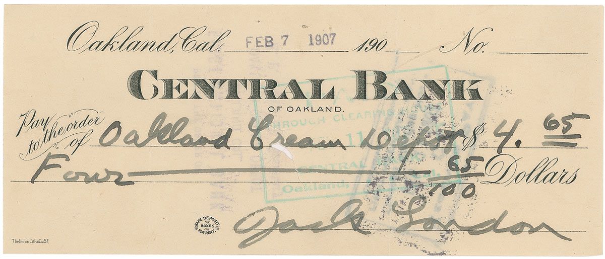 Bank check, 6.5 x 2.75, filled out and signed by London, payable to Oakland Cream Depot for $4.65, stamp-dated February 7, 1907. In very good condition, with small cancellation cut to center and several bank stamps top body, with a couple over portions of signature.