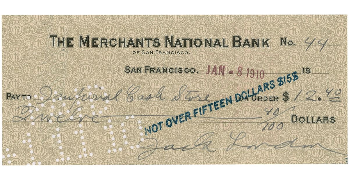 Bank check, 6.25 x 2.75, filled out and signed by London, payable to Imperial Cash Store for $12.40, stamp-dated January 8, 1910. A central vertical fold, expected stamps to both sides, and cancellation holes touching opening stroke of signature, otherwise fine condition.