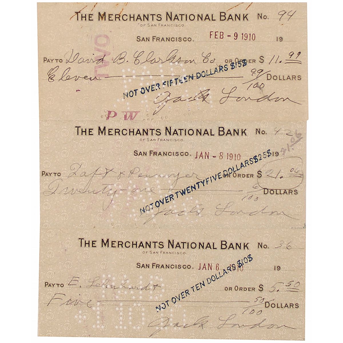 Three bank checks, all 6.25 x 2.5, all filled out and signed by London, and all stamp-dated from 1910. In very good condition, with expected holes and stamps, a few pencil notations, and rusty paperclip marks to top of one check.