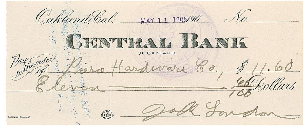 Popular American novelist (1876–1916), best known for such adventure classics as The Call of the Wild, The Sea-Wolf, and White Fang, who drew his writings from his experiences as a prospector, hobo, pirate, gentleman farmer, reformer, and war correspondent. Though plagued by addiction to drugs and alcohol, London wrote prolifically and was the highest-paid American writer of his day. Bank check, 6.5 x 2.75, filled out and signed by London, payable to Pierce Hardware Co. for $11.60, stamp dated May 11, 1905. In fine condition, with a vertical fold to left side, and expected stamps to both sides, none affecting clean signature area.