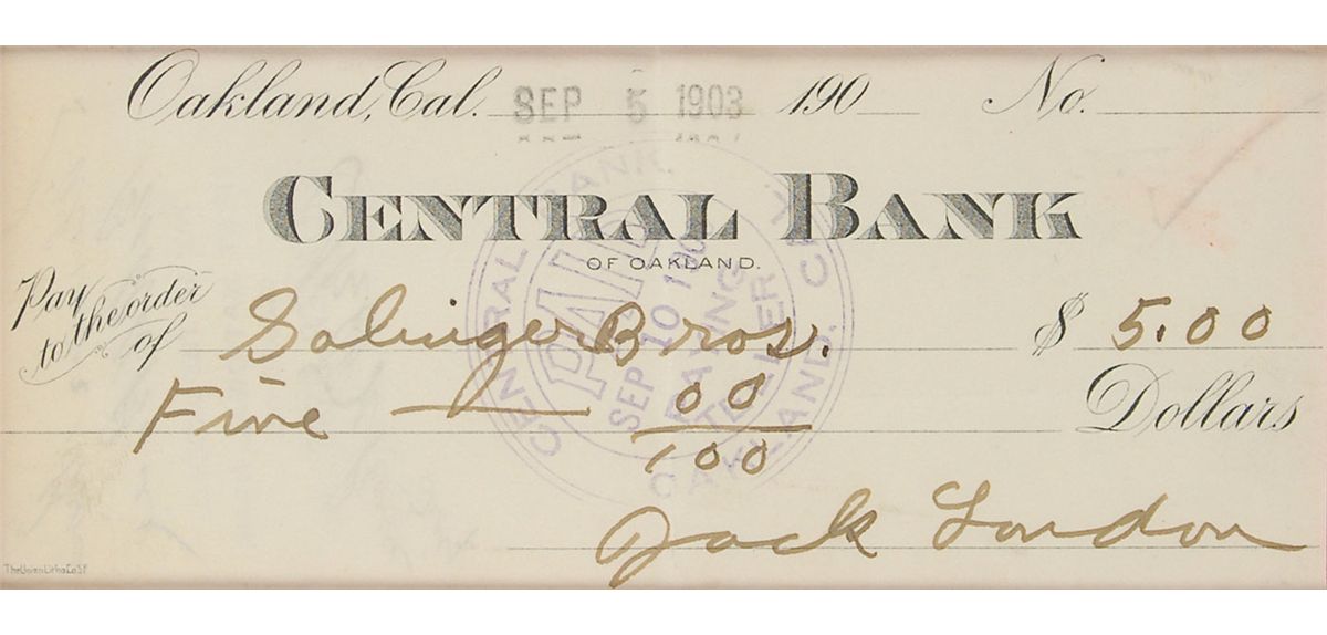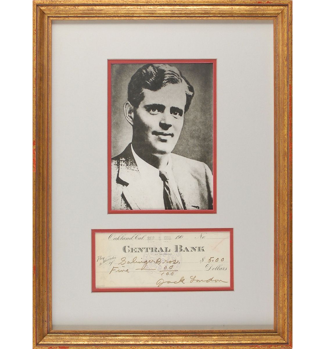 Bank check, 6.25 x 2.5, filled out and signed by London, payable to Salinger Bros. for $5, stamp-dated September 5, 1903. Expertly double-matted and framed with a portrait to an overall size of 12 x 16. In fine condition, with a central vertical fold passing through a single letter of the signature, and expected bank stamps and notations.