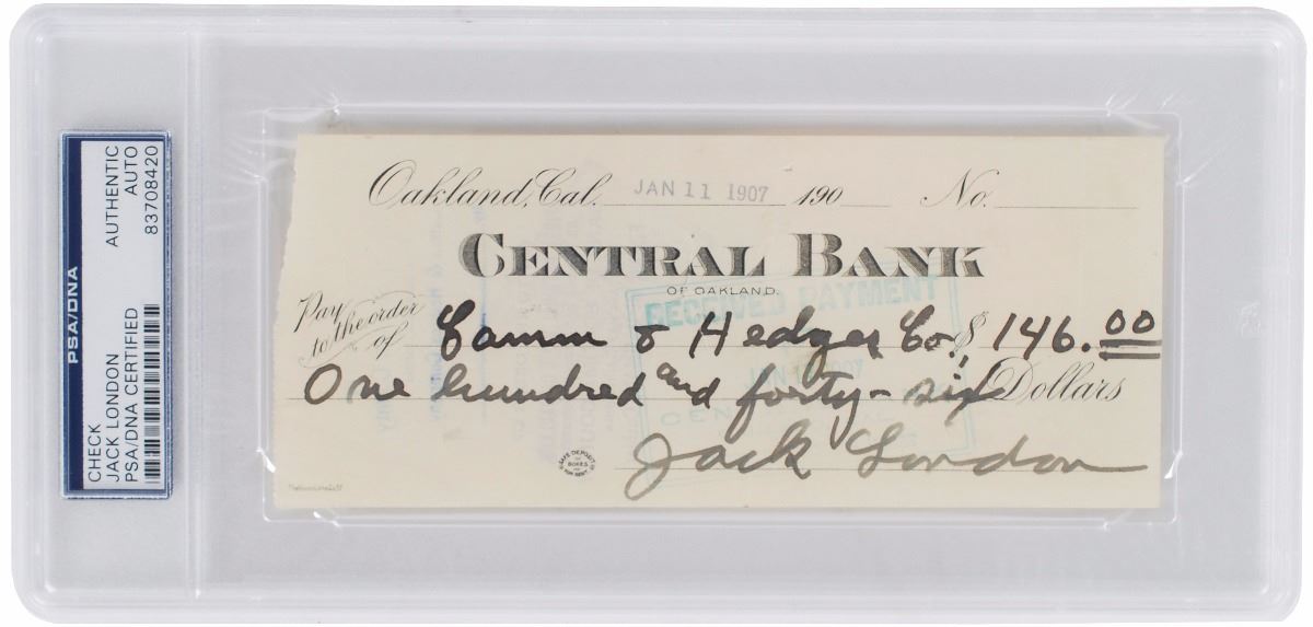 Central Bank of Oakland check, 6.5 x 2.75, filled out and signed by London, payable to Camm & Hedges Co. for $146, stamp-dated January 11, 1907. Encapsulated in a plastic PSA/DNA authentication holder. In fine condition, with paper loss to left edge.