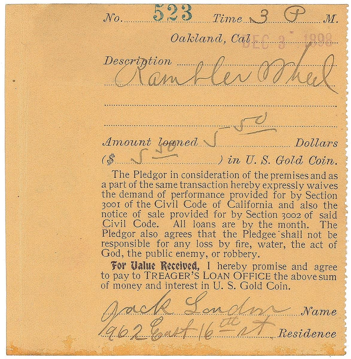 DS, one page, 3.75 x 4, December 3, 1898. Loan payment of $5.50 in US gold coin for a “Rambler Wheel,” filled out entirely in black ink by Jack London, who signs at the conclusion and adds his address, “962 East 16th St.” In fine condition, with light show-through from old mounting remnants on the reverse.