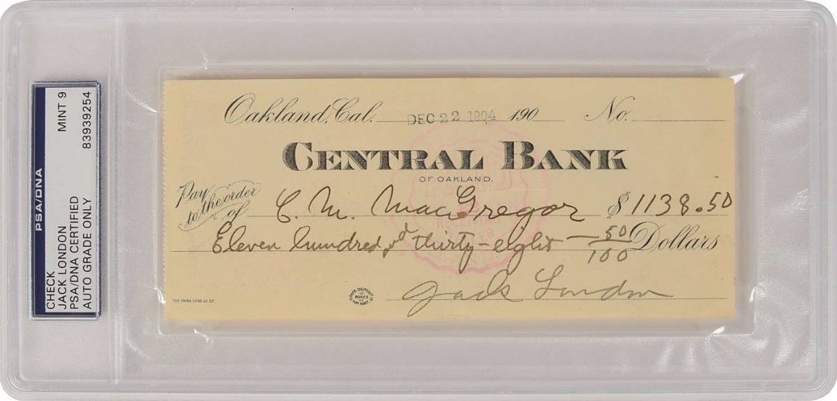 Central Bank of Oakland check, 6.5 x 2.75, filled out and signed by London, payable to C. M. MacGregor for $1138.50, stamp-dated December 22, 1904. Encapsulated in a plastic PSA/DNA authentication holder. In fine condition.