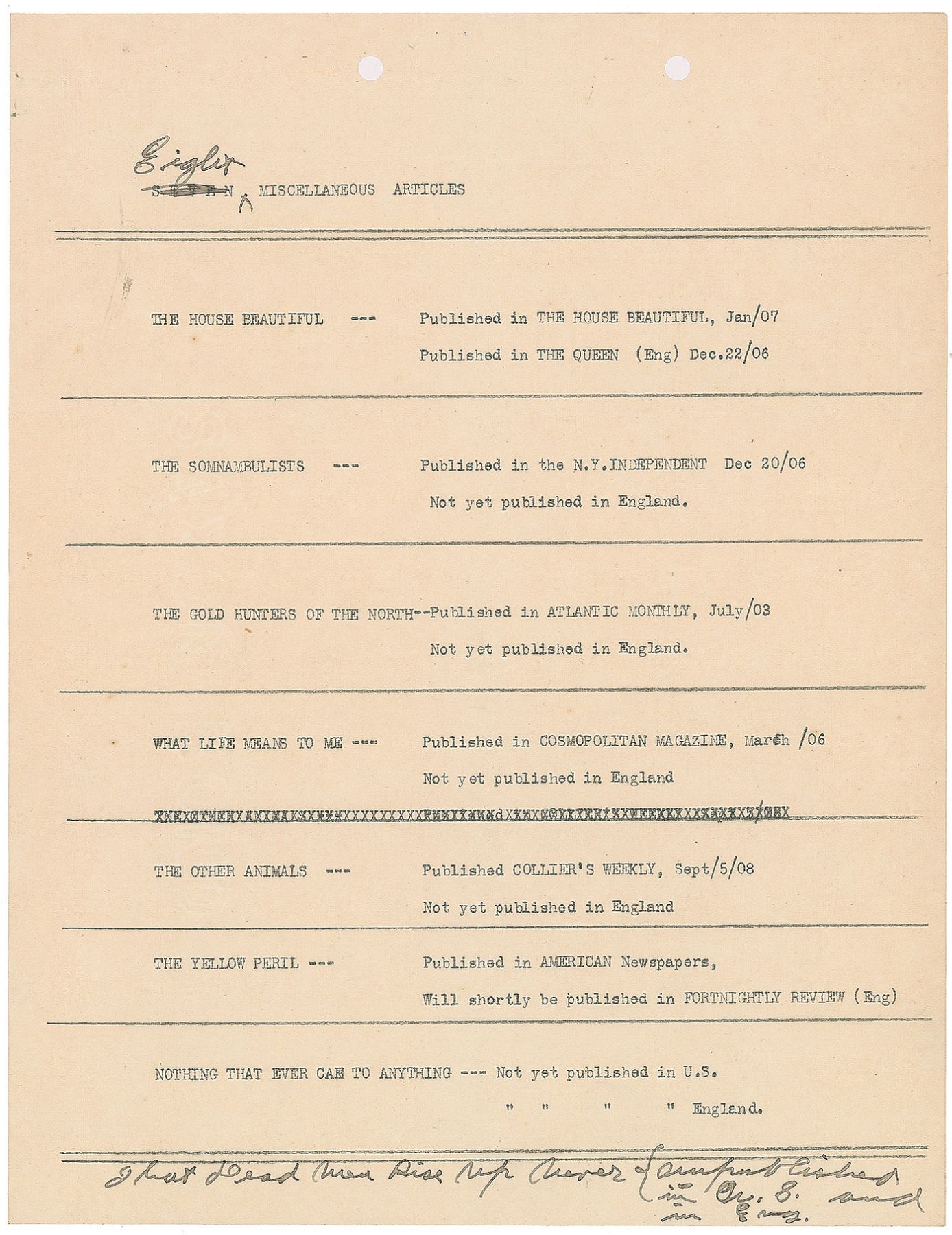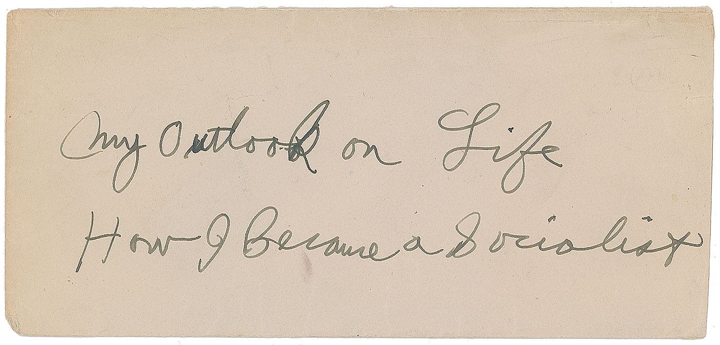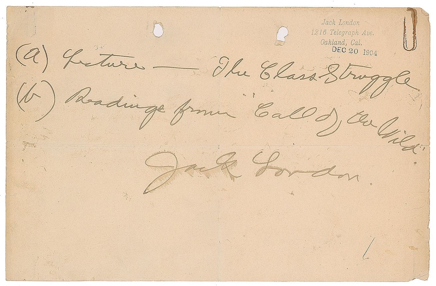 Amusing group lot of four unrelated items, each annotated in ink by London, including: a trimmed 9.25 x 6 sheet bearing London’s personal address stamp in the upper right, postmarked December 20, 1904, with London making a short list and signing below: “(a) Lecture—The Class Struggle, (b) Readings from ‘Call of the Wild,’ Jack London”; an 8.5 x 11 onionskin sheet headed “Horse Medicines,” with the final ingredient for the “Tonic Digestive” section circled by London, who adds: “for exceptionally run-down condition & severe cold”; an 8.5 x 11 sheet bearing a list of published short works by London, who emends the header to read, “Eight Miscellaneous Articles,” and adds the final work in the lower border: “That Dead Men Rise Up Never”; and a sealed 9 x 4.25 mailing envelope, which reads: “My Outlook on Life, How I Became a Socialist.” In overall very good to fine condition. An exceptional small collection of London items that touch on several aspects of the author's brief but celebrated life; the year 1904 saw the publication of The Sea-Wolf, which sold out immediately on the strength The Call of the Wild, which was released the year prior; draft horses were among London’s passions on his Beauty Ranch in Sonoma County, California; 'That Dead Men Rise Up Never' was published as part of the short story collection The Human Drift in 1917; and in 1903, he published the essay 'How I Became a Socialist,' which shares that his views were influenced by London's experience working laborious, low-paying jobs.