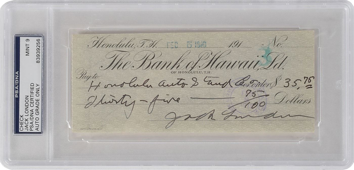 Bank check, 6.5 x 2.75, filled out and signed by London, payable to Honolulu Auto Stand Co. for $35, February 5, 1915. Encapsulated in a plastic PSA/DNA authentication and grading holder, evaluating the autograph as "Mint 9." In fine condition.
