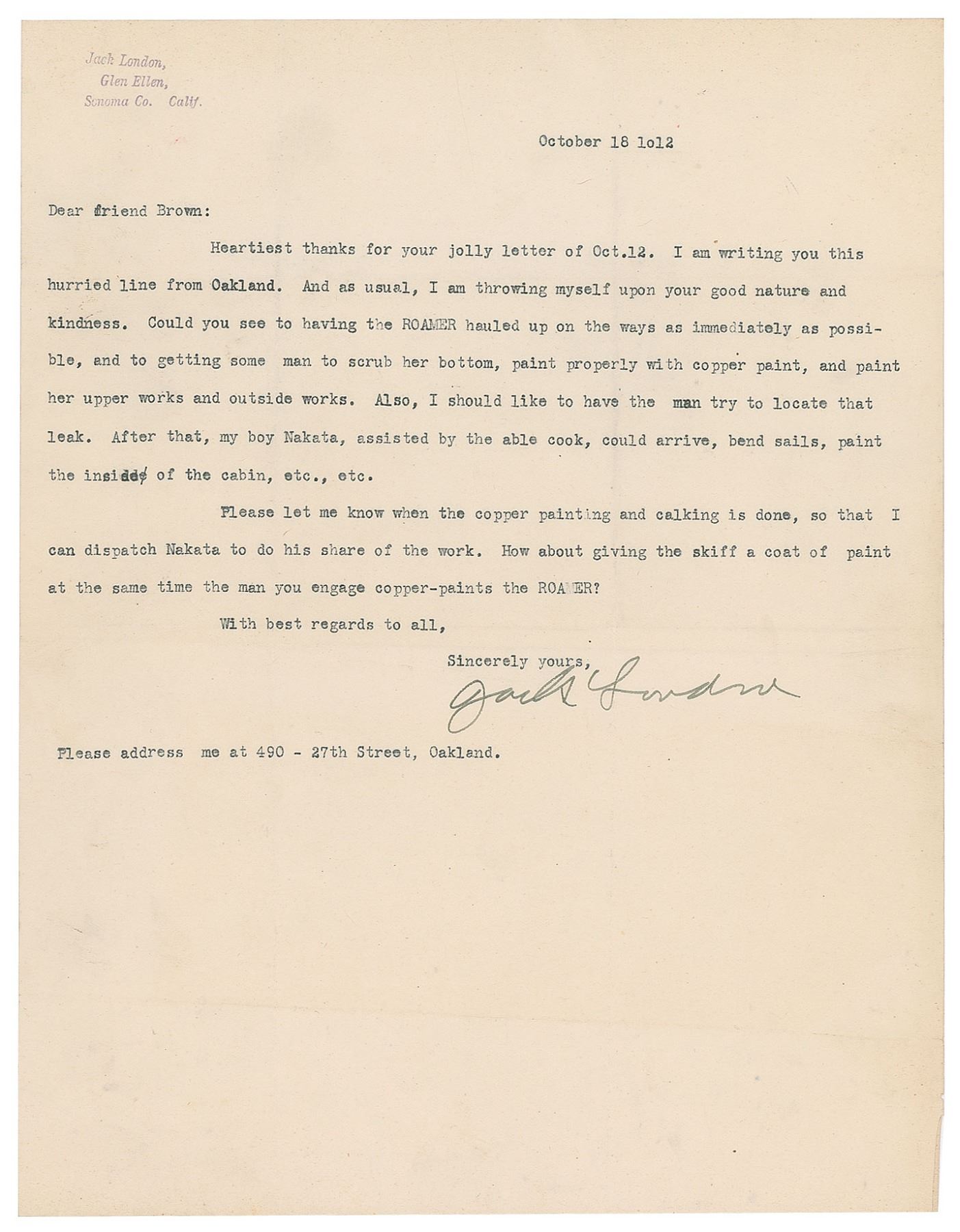 TLS, one page, 8.5 x 11, October 18, 1912. Letter to John A. Browne of the Vallejo Yacht Club, in full: "Heartiest thanks for your jolly letter of Oct. 12. I am writing you this hurried line from Oakland. And as usual, I am throwing myself upon your good nature and kindness. Could you see to having the Roamer hauled up on the ways as immediately as possible, and to getting some man to scrub her bottom, paint properly with copper paint, and paint her upper works and outside works. Also, I should like to have the man try to locate that leak. After that, my boy Nakata, assisted by the able cook, could arrive, bend sails, paint the inside of the cabin, etc., etc. Please let me know when the copper painting and calking is done, so that can dispatch to do his share of the work. How about giving the skiff a coat of paint at the same time the man you engage copper–paints the Roamer?" London adds a short postscript: "Please address me at 490–27th Street, Oakland." In very good to fine condition, with some light creasing and several intersecting folds. London bought an old 30-foot-long wooden boat named Isis for $175 in October 1910, renamed it Roamer, and kept it on the Napa River near the Vallejo Yacht Club, at which he soon attained membership. The next year, London began construction of his dream house on the Beauty Ranch near Glen Ellen. He made Beauty Ranch, now the Jack London State Park, his permanent home—and the Napa River and the Vallejo Yacht Club his home port.