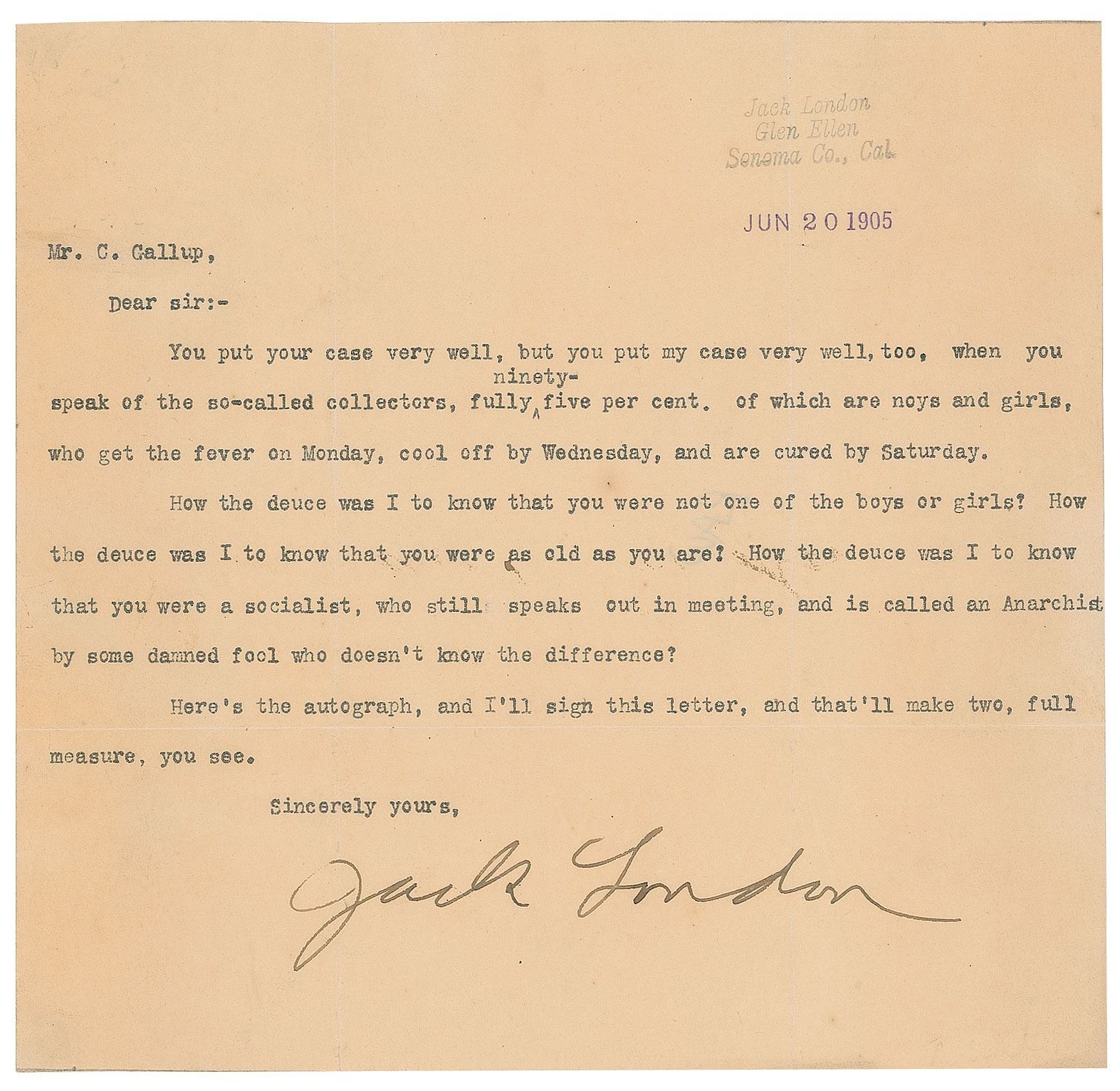 TLS, one page, 7.25 x 7, stamp-dated June 20, 1905. Letter to C. Callup, in full: "You put your case very well, but you put my case very well, too, when you speak of the so-called collectors, fully ninety-five per cent of which are noys [sic] and girls, who get the fever on Monday, cool off by Wednesday and are cured by Saturday. How the deuce was I to know that you were not one of the boys or girls? How the deuce was I to know that you were as old as you are? How the deuce was I to know that you were a socialist, who still speaks out in meetings, and is called an Anarchist by some damned fool who doesn't know the difference? Here's the autograph, and I'll sign this letter, and that'll make two, full measure, you see." In fine condition, with somewhat closely trimmed edges.