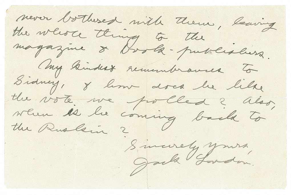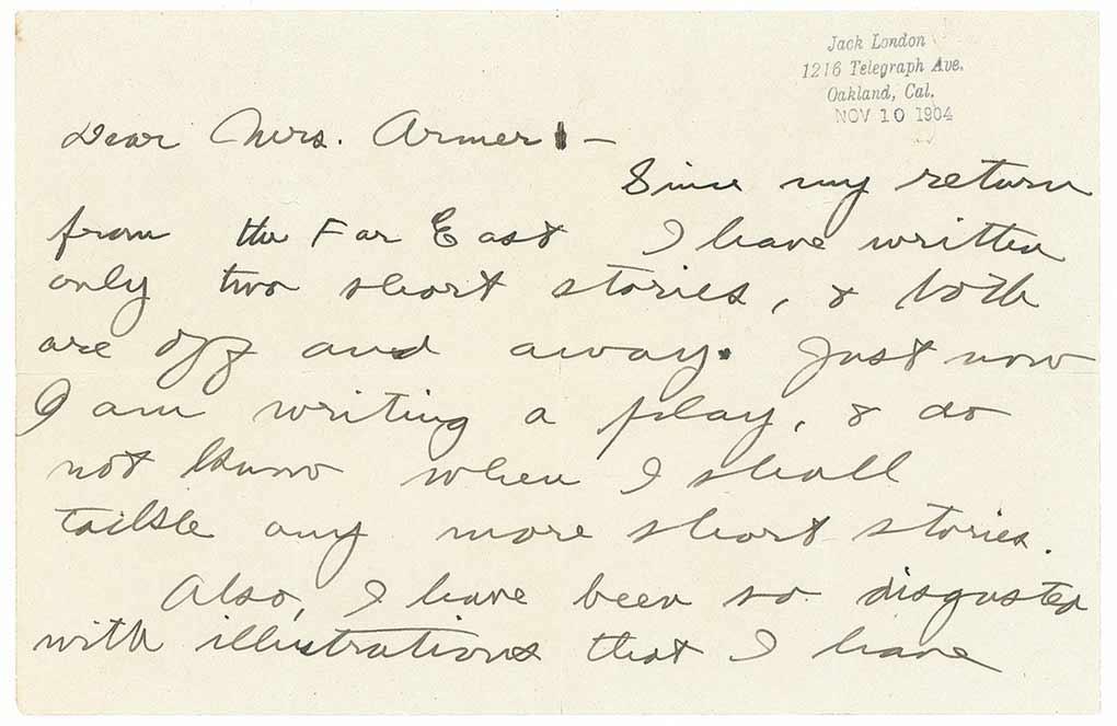 Popular American novelist (1876–1916), best known for such adventure classics as The Call of the Wild, The Sea-Wolf, and White Fang, who drew his writings from his experiences as a prospector, hobo, pirate, gentleman farmer, reformer, and war correspondent. Though plagued by addiction to drugs and alcohol, London wrote prolifically and was the highest-paid American writer of his day. ALS, two pages, 9.25 x 6, November 10, 1904. Letter to Sidney Armer in Berkeley, California. In part: “Since my return from the Far East I have written only two short stories, & both are off and away. Just now I am writing a play, & do not know when I shall tackle any more short stories. Also, I have been so disgusted with illustrations that I have never bothered with them, leaving the whole thing to the magazine & book publishers.” Accompanied by the original mailing envelope. Professional repairs to folds on reverse of second page, light uniform toning, bisecting vertical mailing folds, and a few wrinkles, otherwise fine condition. Five months earlier, London had returned from a trip to Asia where he had served as a correspondent, visiting China and Korea, and held for court-martial by the Japanese. The day this letter was written, he published a story in the San Francisco Examiner entitled, “Big Socialist Vote is Fraught with Meaning, Great Socialist Vote Explained” which offered a greeting to Russian Socialists from Japanese Socialists, using his new international fame to speak for his Japanese comrades. The day after this letter was written, London was granted a divorce from his first wife, Bessie.