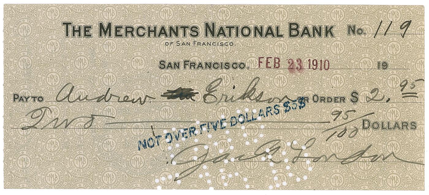 Bank check, 6.25 x 2.75, filled out and signed by London, payable to Andrew Erikson for $2.95, stamp-dated February 23, 1910. Four vertical folds, a couple through letters of signature, and cancellation holes over portion of signature, otherwise fine condition. Pre-certified PSA/DNA and RRAuction COA.