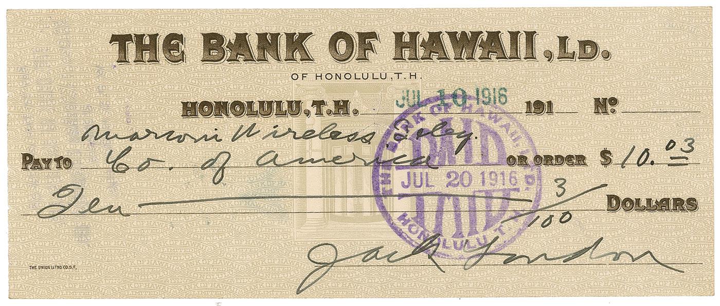 Bank check, 6.75 x 2.75, filled out and signed by London, payable to Marconi Wireless Teleg. Co. of America for $10.03, stamp-dated July 10, 1916. Three vertical folds, one through a single letter of signature, bank stamp to body lightly touching a few letters of signature, and a cancellation cut to upper portion of body, otherwise fine condition.