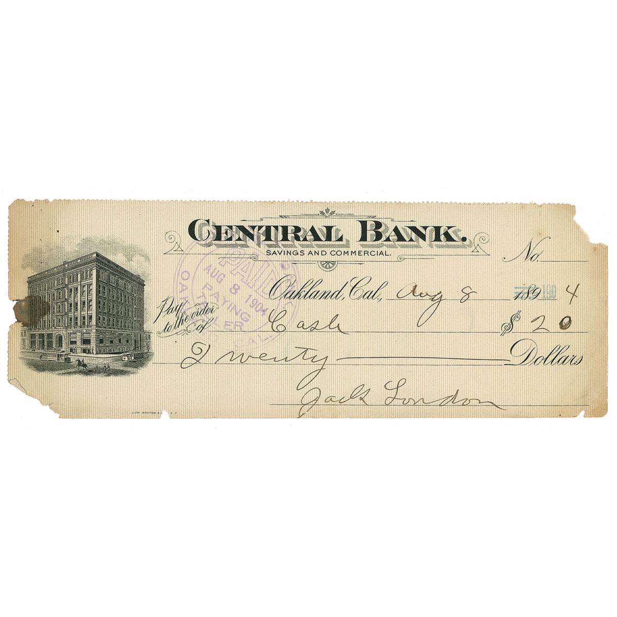 Early bank check, 8.75 x 3.25, filled out and signed by London, payable to Cash for $20.00, August 8, 1904. Tiny paper separation just touching the first letter of his name, scattered soiling, moderate toning along the edges, edge chips, missing upper right corner, and an expected bank cancellation stamp, otherwise very good condition. Seldom seen with such an early date.