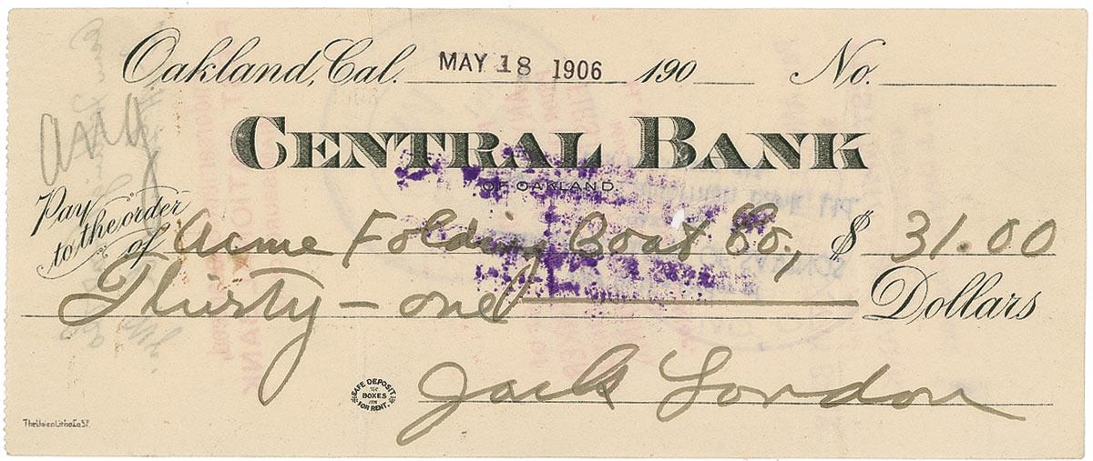 Bank check, 6.5 x 2.75, filled out and signed by London, payable to Acme Folding Boat Co. for $31.00, stamp-dated May 18, 1906. Vertical folds passing through his name, a small cancellation hole, and expected bank cancellation stamps, otherwise fine condition.