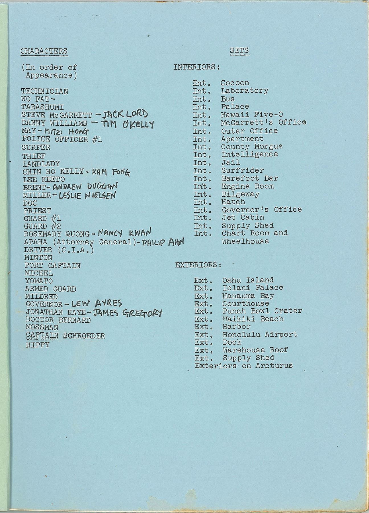 Jack Lord's personally-owned script for the pilot of Hawaii Five-O by Leonard Freeman, entitled "Five-O," 102 pages, dated June 16, 1967, signed on the cover in thick black felt tip, "Jack Lord." The episode, released under the title 'Cocoon,' was the first of 279 episodes to air during the show's twelve-season run. The script has many colored revision pages, and includes a "'Five-O' Pilot Production Crew List." In very good to fine condition, with scattered staining to the cover. Accompanied by a letter of provenance from executors of the estate of Jack Lord. Provenance: Bonhams, June 2011.
