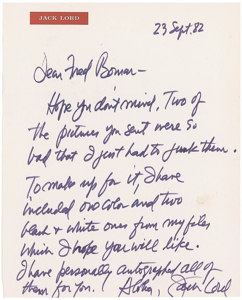 ALS, 8.5 x 10.5, personal letterhead, September 23, 1982. Response to an autograph request. In full: “Hope you don’t mind. Two of the pictures you sent were so bad that I just had to junk them. To make up for it, I have included one color and two black & white ones from my files which I hope you will like. I have personally autographed all of them for you.” In fine condition, with light wrinkling and a couple mild spots of soiling.