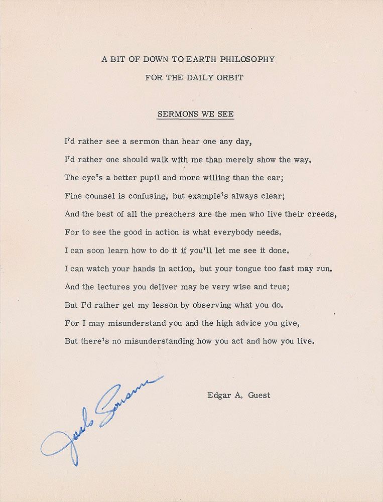 Two identical souvenir typescripts of the poem "Sermons We See" by Edgar A. Guest, each one page, 8 x 10.5, both signed in the lower left corner in blue felt tip by Jack Lousma. The poem is headed "A bit of down to earth philosophy for the daily orbit," and begins: "I'd rather see a sermon than hear one any day, / I'd rather one should walk with me than merely show the way." In overall fine condition.