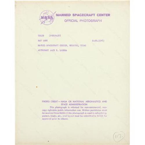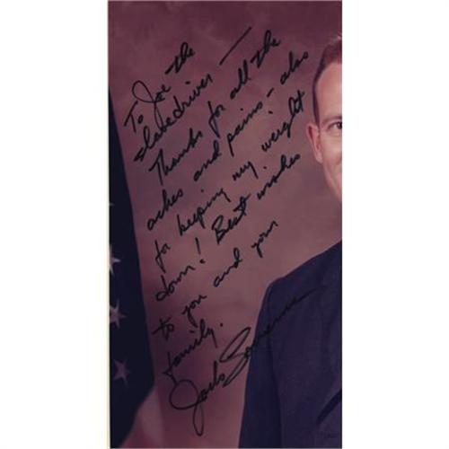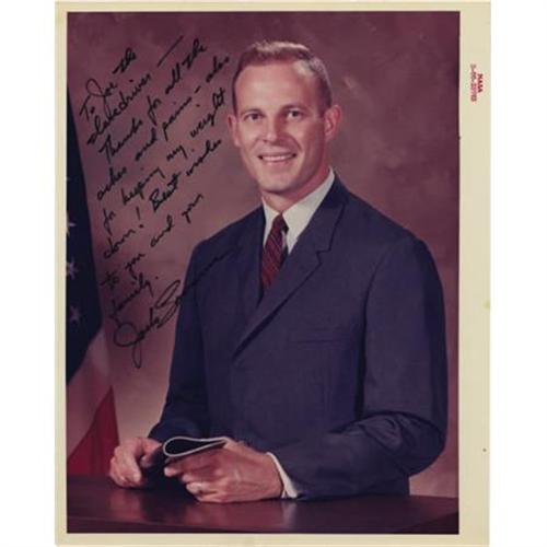 <B>Jack Lousma Signed Color Photograph,</B></I> 8" x 10", "<I>To Joe the/ slavedriver-/ Thanks for all the/ aches and pains - also/ for keeping my weight/ down! Best wishes/ to you and your/ family./ Jack Lousma.</B></I>" <I>From the collection of renowned former physical trainer of the astronauts Joe Garino. This lot is accompanied by a signed certificate of authentication from Garino verifying its provenance.</B></I><BR><BR><b>Shipping:</b> Flat Material, Small (<a target="_blank" href="http://www.heritageauctions.com/common/shipping.php">view shipping information</a>)