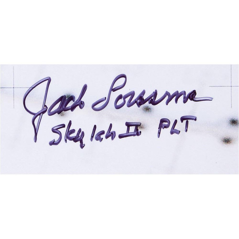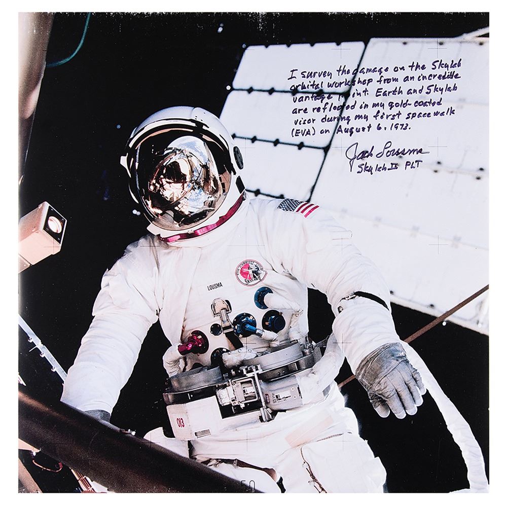 Uncommonly large color glossy 23 x 23 photo of Pilot Jack Lousma performing an EVA during the Skylab 3 mission, signed in black felt tip, “I survey the damage on the Skylab orbital workshop from an incredible vantage point. Earth and Skylab are reflected in my gold-coated visor during my first spacewalk (EVA) on August 6, 1973. Jack Lousma, Skylab II PLT.†In fine condition, with apparent scuffs and wear inherent to the original image and not the photo.