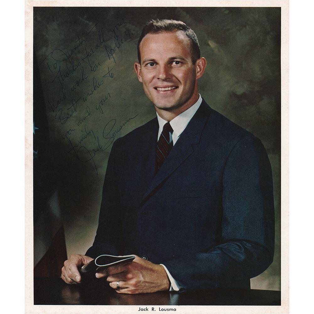 Official color vintage 8 x 10 NASA lithograph of Lousma in a suit and tie, signed and inscribed in blue ballpoint, "To Juanita—Thanks for all your hard work on Apollo 9. Best wishes to you and your family, Jack Lousma.†In fine condition, with foxing to the reverse (not affecting the image). Lousma served as a member of the astronaut support crew for Apollo 9. From the collection of Apollo flight crew support member Juanita Adkins.