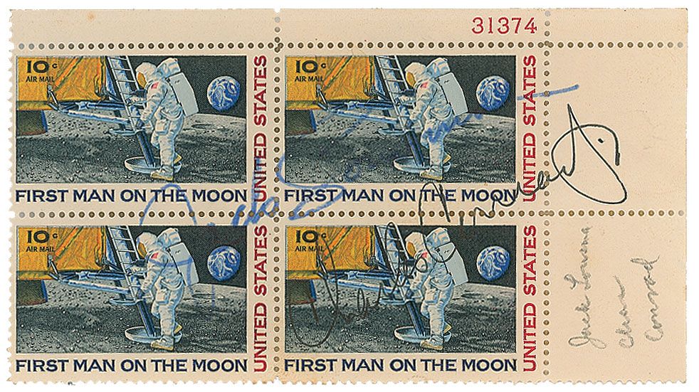 Block of four First Man on the Moon postage stamps, 5 x 2.75, signed in blue felt tip, “Jack Lousma,” and black ink, “Charles Conrad, Jr.” Moderate contrast to the signatures, Lousma’s signature slightly faded, and a pencil notation to the lower right, otherwise fine condition.
