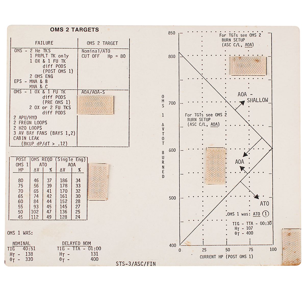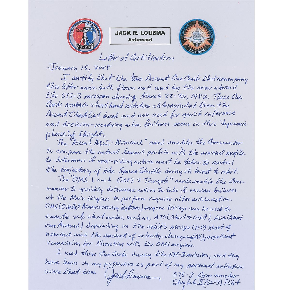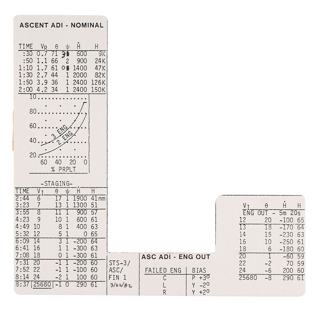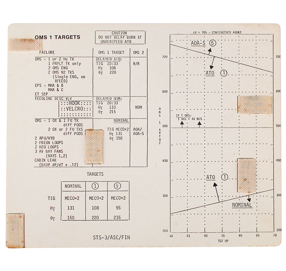 Flown pair of cue cards carried on the Space Shuttle Columbia during the STS-3 mission: a double-sided card headed “OMS 1 Targets” and “OMS 2 Targets,” bearing several affixed swatches of Velcro to both sides, 8 x 6.75, listing procedures enabling the commander to determine the action to take in case of main engine failure; and a single-sided card headed ”Ascent ADI—Nominal,” bearing two swatches of Velcro affixed to the reverse, 7 x 6.5, enabling the commander to determine if overriding action must be taken to control the trajectory of the Space Shuttle during its boost to orbit. In overall fine condition. Accompanied by a detailed handwritten and signed letter of provenance from Lousma, in part: "The two Ascent Cue Cards that accompany this letter were both flown and used by the crew aboard the STS-3 missions during March 22–30, 1982. These cards…are used for quick reference and decision-making when failures occur in this 'dynamic phase' of flight."