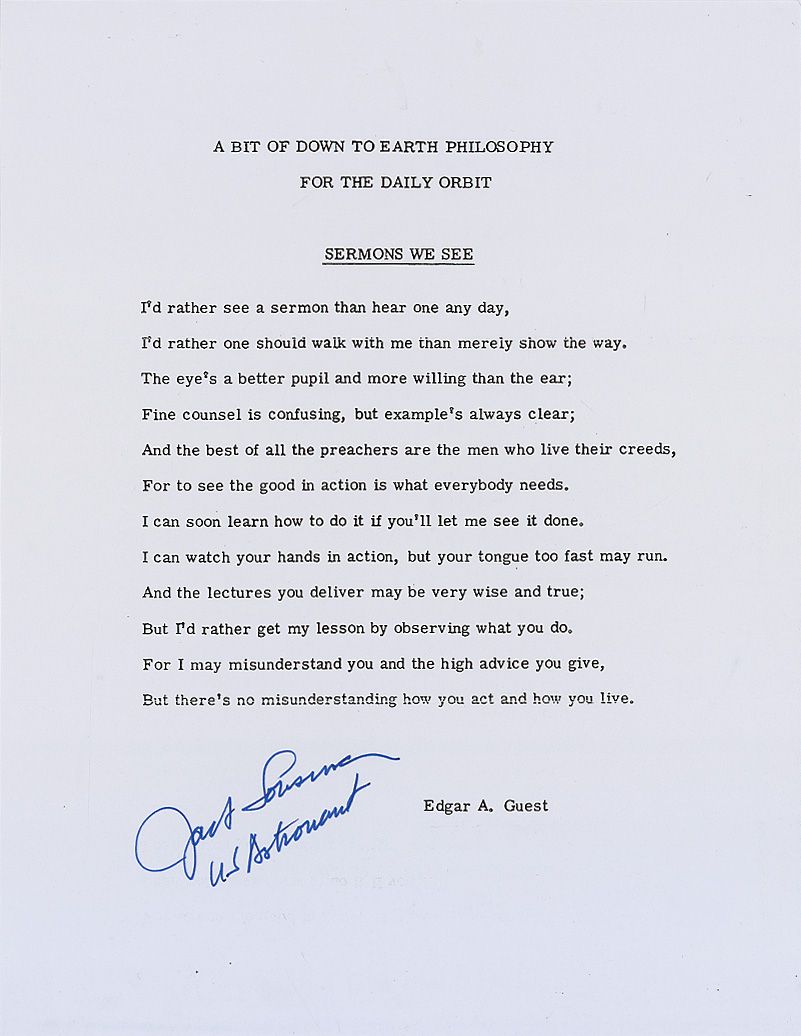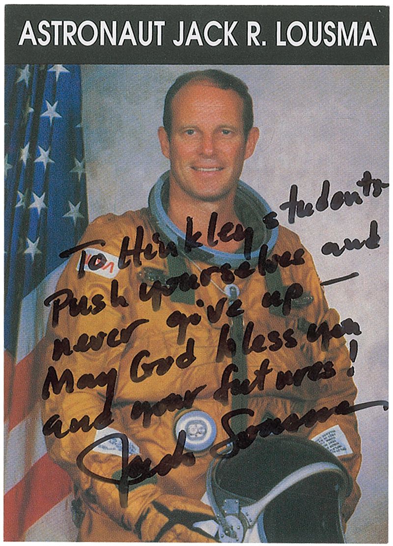 Color 2.5 x 3.5 trading card, signed and inscribed in black felt tip, “To Hinkley students, push yourselves and never give up—May God bless you and your futures! Jack Lousma”; and a printed poem entitled ‘Sermons We See’ by Edgar Guest, one page, 8.5 x 11, signed in blue felt tip by Lousma. In fine condition.