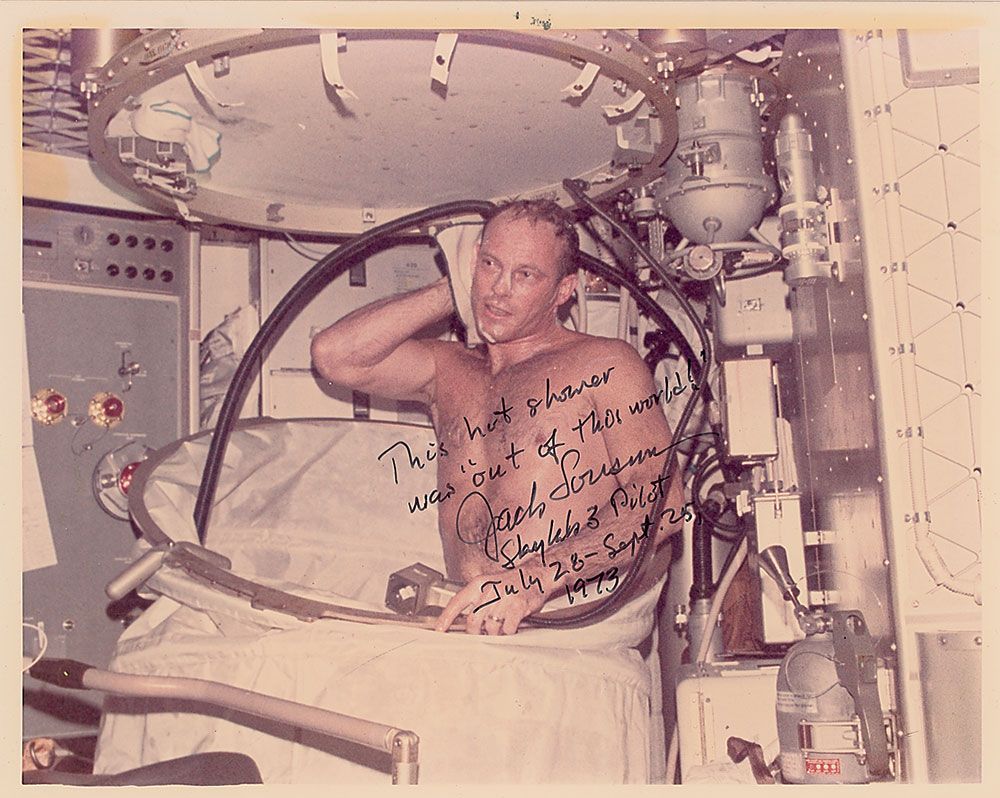 Color glossy 10 x 8 NASA photo of Lousma showering in the crew quarters on Skylab, signed in black felt tip, “This hot shower was ‘out of this world!’ Jack Lousma, Skylab 3 Pilot, July 28–Sept. 25, 1973.” In fine condition, with inconsequential marks and toning to the upper border.